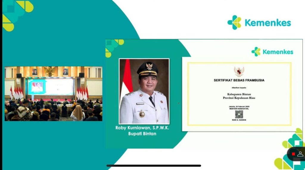 BINTAN, (kepriraya.com)– Kabupaten Bintan resmi dinyatakan bebas dari penyakit Frambusia bersama 89 Kabupaten/Kota lainnya di Indonesia. Status ini ditandai dengan penyerahan Sertifikat Bebas Frambusia dari Kementerian Kesehatan (Kemenkes) RI, Rabu (20/8) di Ruang Siwabessy, Gedung Prof. Sujudi, Kantor Kemenkes RI.