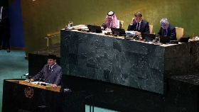 Sambutan President Indonesian Prabowo Subianto di Markas Besar PBB, New York, Senin (22/9/2025).