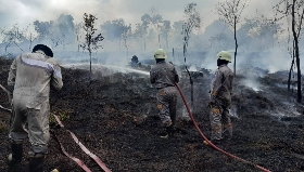 Petugas Damkar ketika melakukan pemadaman Kebakaran lahan terjadi di areal PT SBP Lobam, Blok I.5A, Jalan Raya Busung, Kelurahan Teluk Lobam, Kecamatan Seri Kuala Lobam, Senin (29/9) siang.