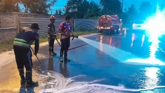 Damkar Tanjung Uban Lakukan Penyemprotan Tumpahan Solar di Jalan Manggar
