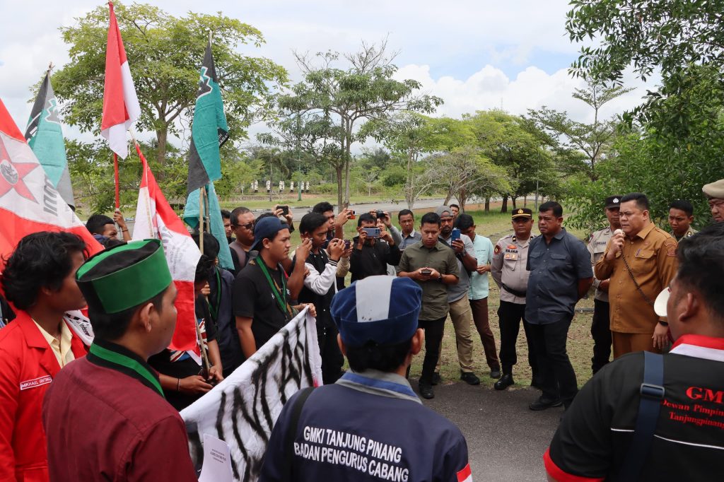 Sekretaris Daerah Kabupaten Bintan, Ronny Kartika menerima aspirasi Aliansi yang terdiri dari HMI, Hima Persis, GMNI, dan GMKI di halaman Kantor Bupati Bintan, Selasa (18/11) f-Diskominfo Bintan