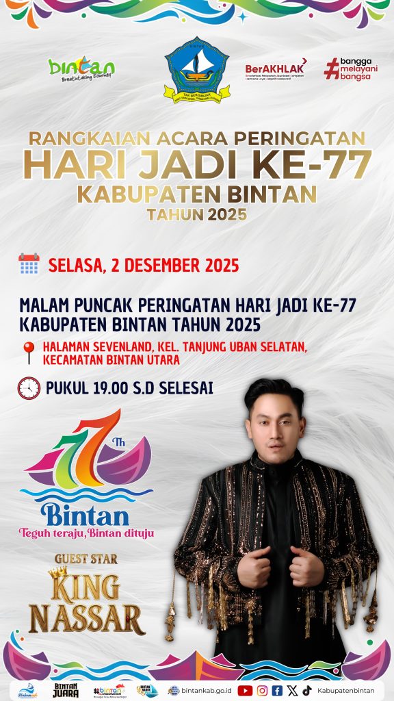 Peringatan Hari Jadi ke-77 Kabupaten Bintan dipusatkan di wilayah utara Kabupaten Bintan. Dengan tema ‘Teguh Teraju, Bintan Dituju’, momentum ini akan menjadi kebanggaan luar biasa bagi seluruh lapisan masyarakat Bintan. Berikut beberapa rangkaian kegiatan peringatan Hari Jadi ke-77 Kabupaten Bintan :