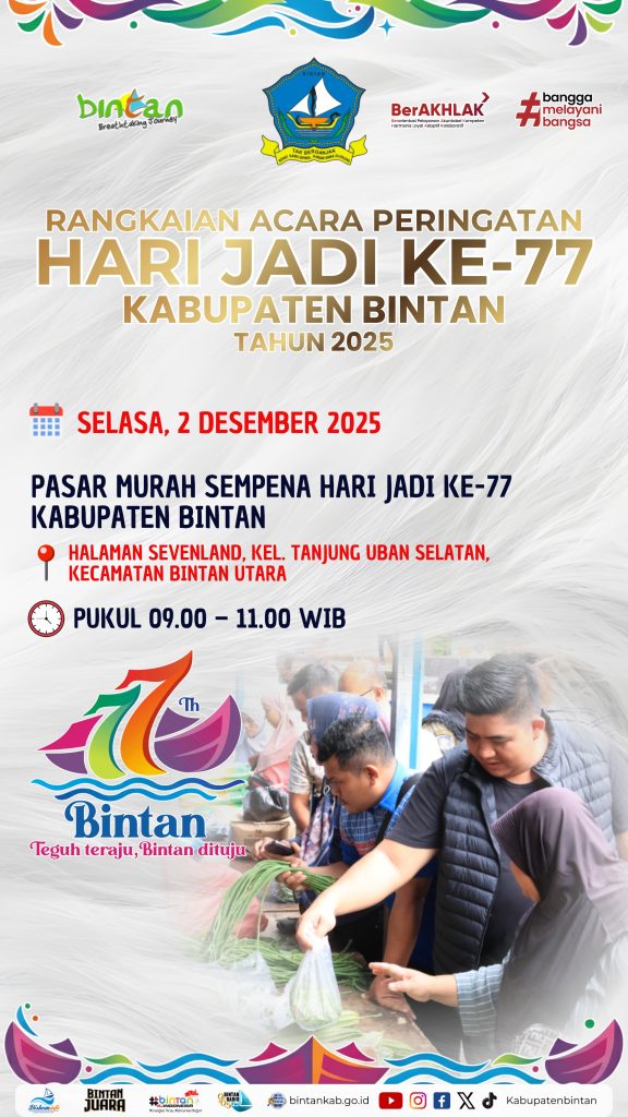 BINTAN, (kepriraya.com)– Menjelang Malam Puncak Hari Jadi ke-77 Kabupaten Bintan, pemerintah daerah kembali menghadirkan Pasar Murah sebagai salah satu kegiatan yang paling dinantikan masyarakat. Kegiatan ini akan digelar pada Selasa, 02 Desember 2025, di Pelataran Sevenland Tanjung Uban, mulai pukul 09.00 hingga 11.00 WIB.
