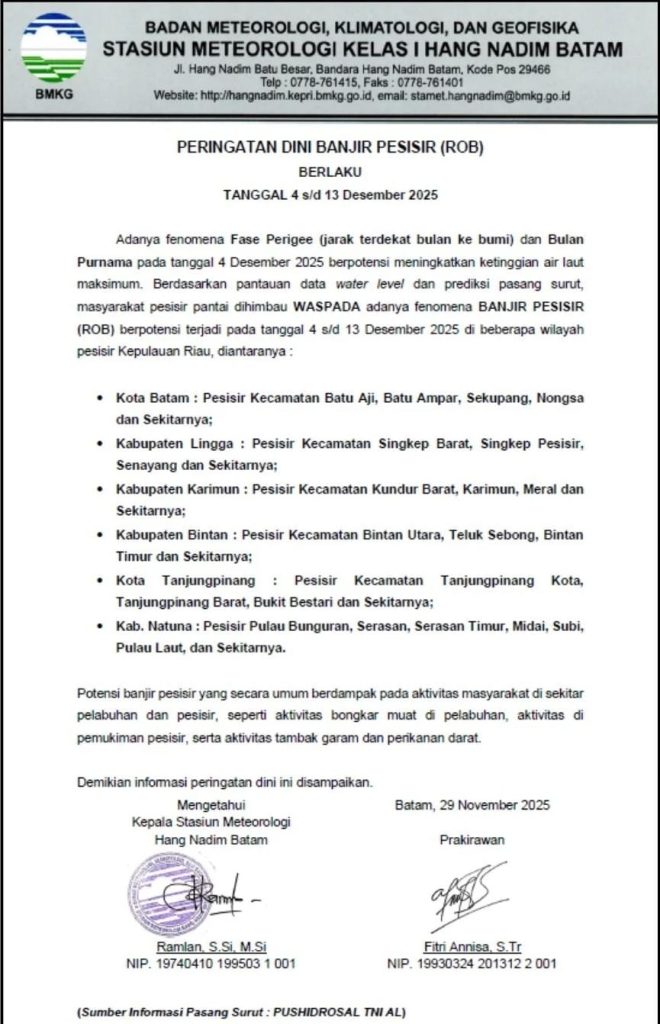 Peringatan dini ini ditandatangani oleh Prakirawan BMKG Hang Nadim, Ramlan, S.Si., M.Si., pada 29 November 2025.