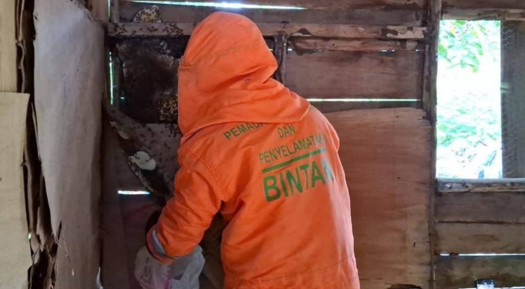 Petugas Damkar Tanjung Uban ketika melakukan edukasi sarang lebah di di dalam rumah warga di Jalan Raya Tanjungpinang–Tanjung Uban, Kampung Bukit Senyum/Kampung Jayapura Gemilang, Desa Lancang Kuning, Kecamatan Bintan Utara, Minggu (14/12/2025). f-Damkar