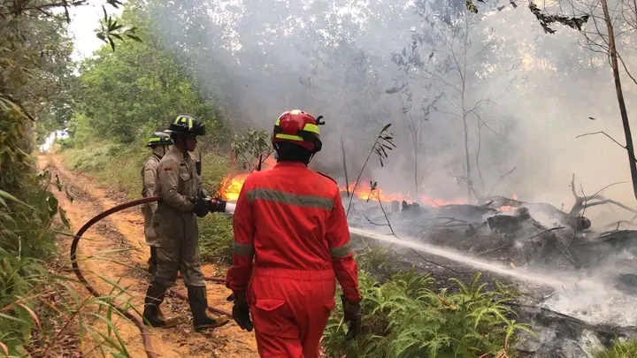 Petugas Damkar ketika melakukan pemadaman Kebakaran lahan dan semak belukar terjadi di Jalan Raya Tanjungpinang–Tanjung Uban, tepatnya di Dusun Jago, Desa Lancang Kuning, Kecamatan Bintan Utara, pada Minggu (25/1/2026) sore.