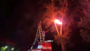Tim Pemadam Kebakaran (Damkar) Tanjung Uban bergerak cepat mengeksekusi sarang tawon vespa yang meresahkan warga di Jalan Raya Tanjungpinang–Tanjung Uban, Gang Akasia, Desa Lancang Kuning, Kecamatan Bintan Utara, Sabtu (21/2/2026) malam.