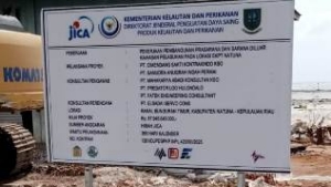 Papan plang proyek pembangunan asar Jepang di Ranai, Kabupaten Natuna.