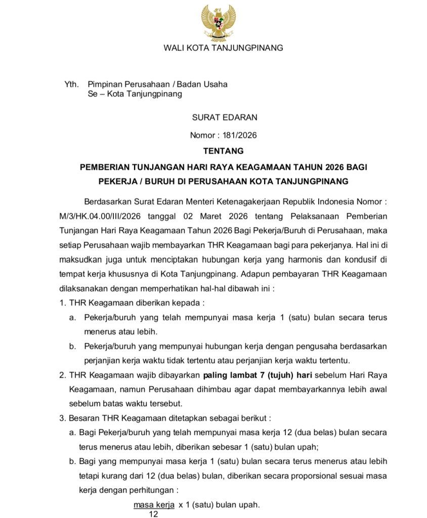 TANJUNGPINANG, (kepriraya.com)– Pemerintah Kota Tanjungpinang menerbitkan Surat Edaran (SE) Nomor 181 Tahun 2026 tentang Pemberian Tunjangan Hari Raya (THR) Keagamaan bagi pekerja atau buruh di perusahaan. Surat edaran tersebut ditujukan kepada seluruh pimpinan perusahaan dan badan usaha se-Kota Tanjungpinang.