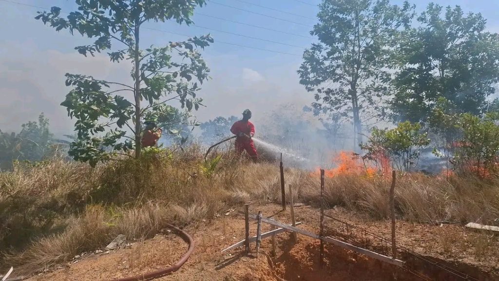 Petugas Damkar saat melakukan pemadaman apa di lahan dan semak belukar terjadi di wilayah Jl Jati Negara 1, Kampung Wono Sari, Kelurahan Kota Baru, Kecamatan Telok Sebong, Sabtu (21/3/2026) f-Damkar