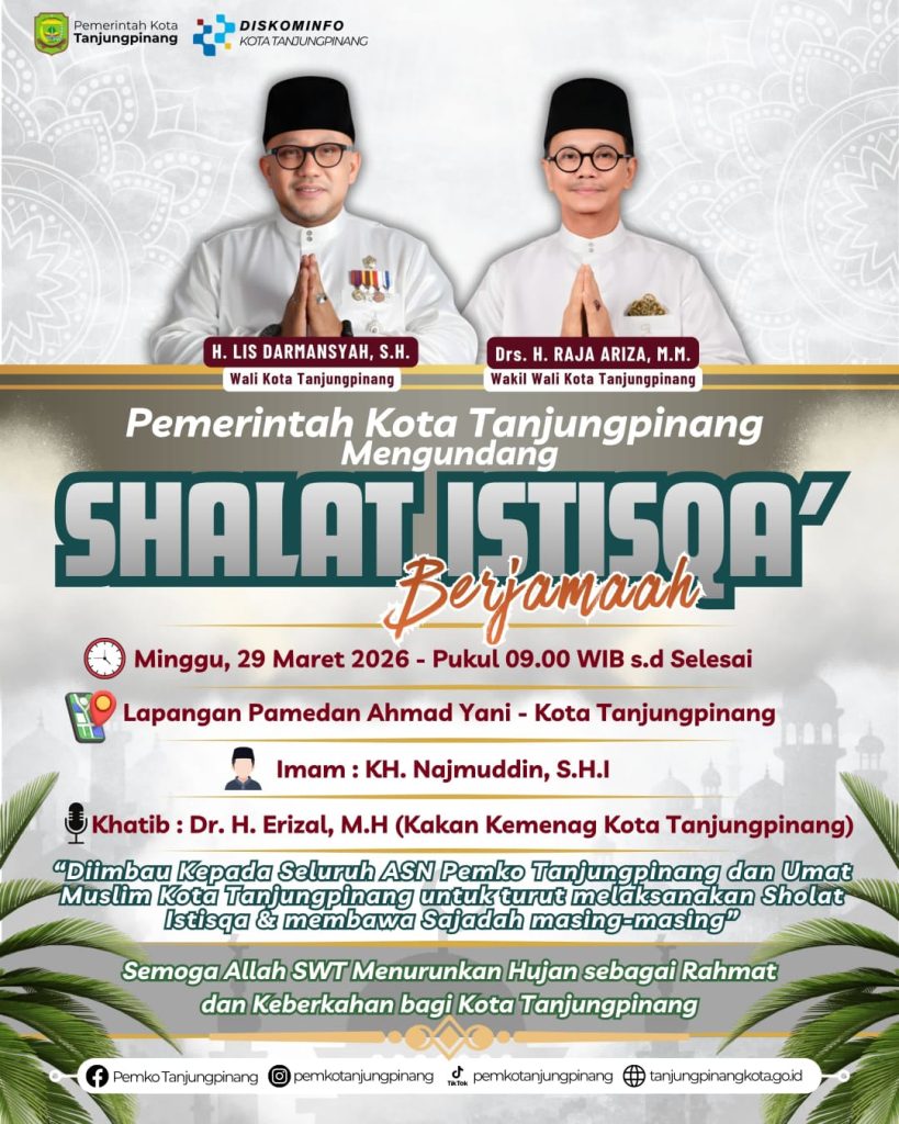 Wali Kota Tanjungpinang, Lis Darmansyah, mengajak seluruh elemen masyarakat untuk hadir dan berpartisipasi dalam doa bersama tersebut, sebagai wujud kebersamaan dan harapan agar Allah SWT menurunkan hujan yang membawa rahmat dan keberkahan bagi Kota Tanjungpinang. Jum’at, (27/3/2026)