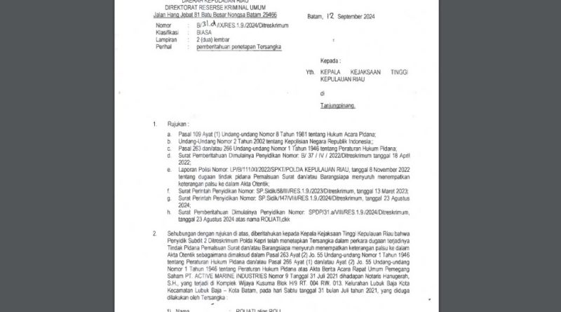 Berikut : nomor B/d.31/IX/RES.1.9/2024/DITRESKRIMUM tertuang Roliati dan Ahmad Rustam Ritonga ditetapkan sebagai tersangka. Jum’at (20/9/2024) f – Rmd /kepriraya.com BATAM,