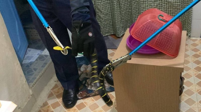 Read MoreTim Damkar Tanjung Uban saat mengevakuasi seekor ular cincin emas sepanjang sekitar 1,5 meter dari sebuah rumah warga di Perum